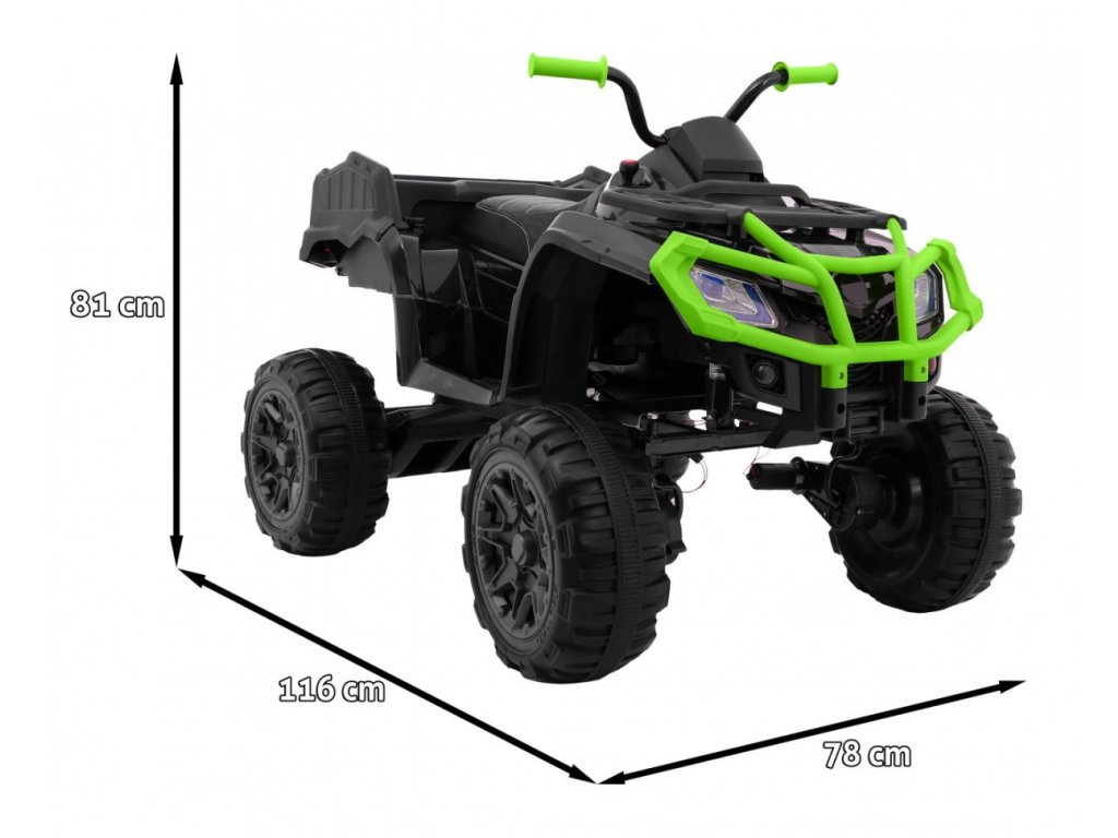 Dětská elektrická čtyřkolka ATV XL má baterii s kapacitou 12V 10Ah a čtyři motory o výkonu 45W, to znamená, že čtyřkolka má pohon 4x4. O pohodlnou jízdu se postarají pěnová EVA kola a sedadlo, které je vyrobeno z ekologické kůže.
