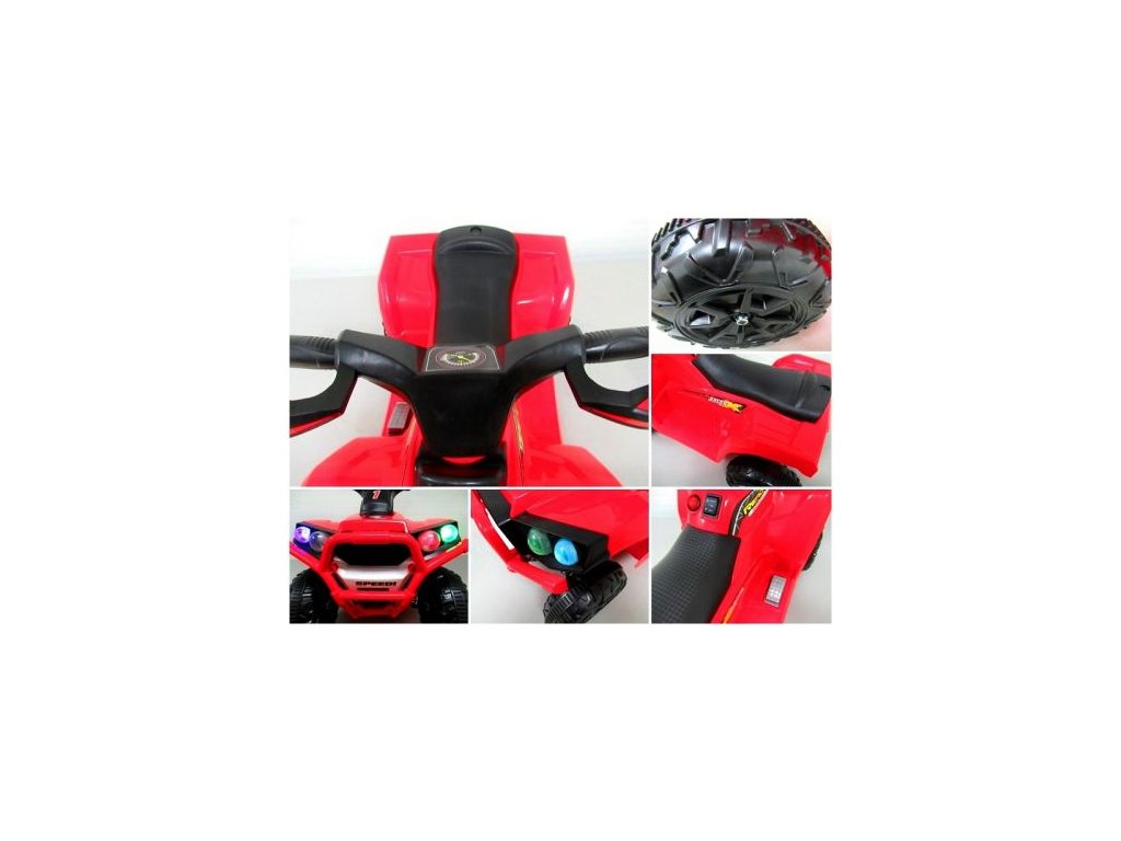 Mezi vybavení patří hudební panel s předem nahranými melodiemi a klaksonem. Čtyřkolka má přední světla, umožňuje jízdu ve všech směrech a její nosnost je do 20 kg.