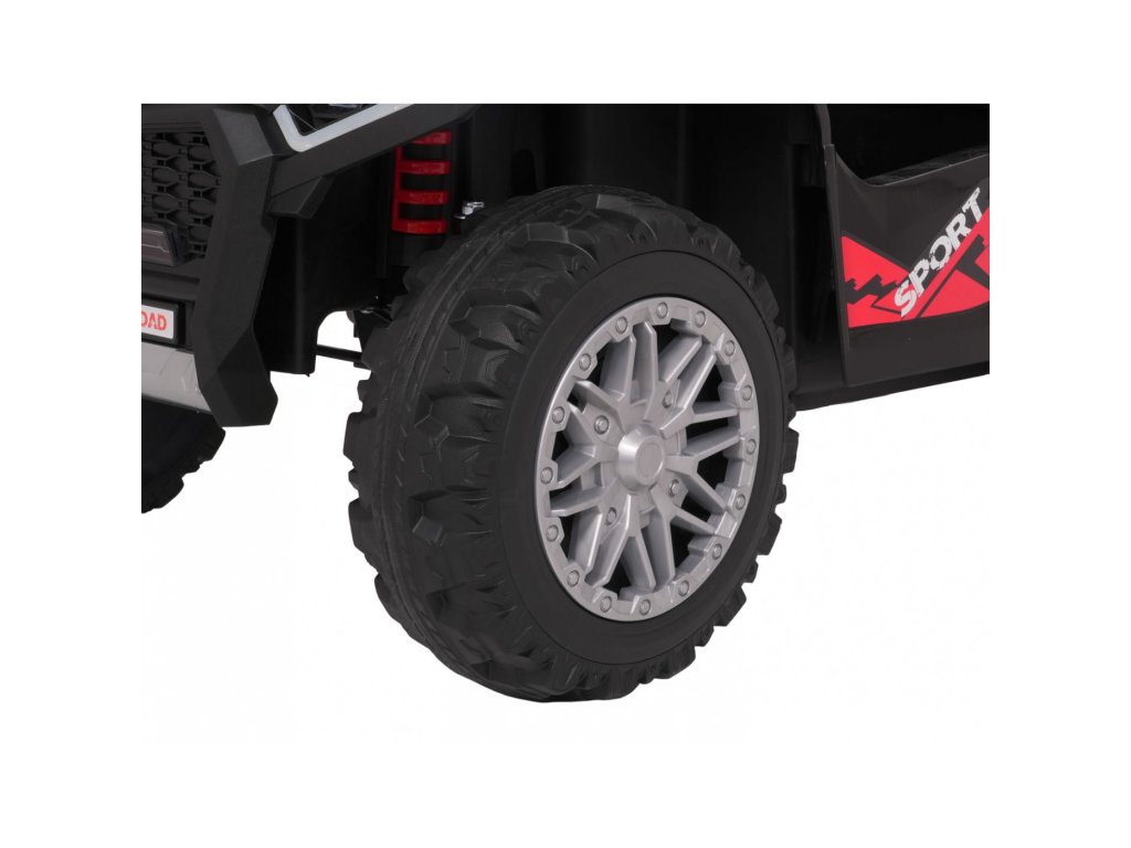 Čtyřkolka je vybavena tichými pěnovými EVA koly o rozměru 26 x 11 cm a odpružením vpředu i vzadu, což zajišťuje pohodlnou a stabilní jízdu i na nerovném terénu. O bezpečí dítěte se starají bezpečnostní pásy a robustní sedačka z černé ekologické kůže.