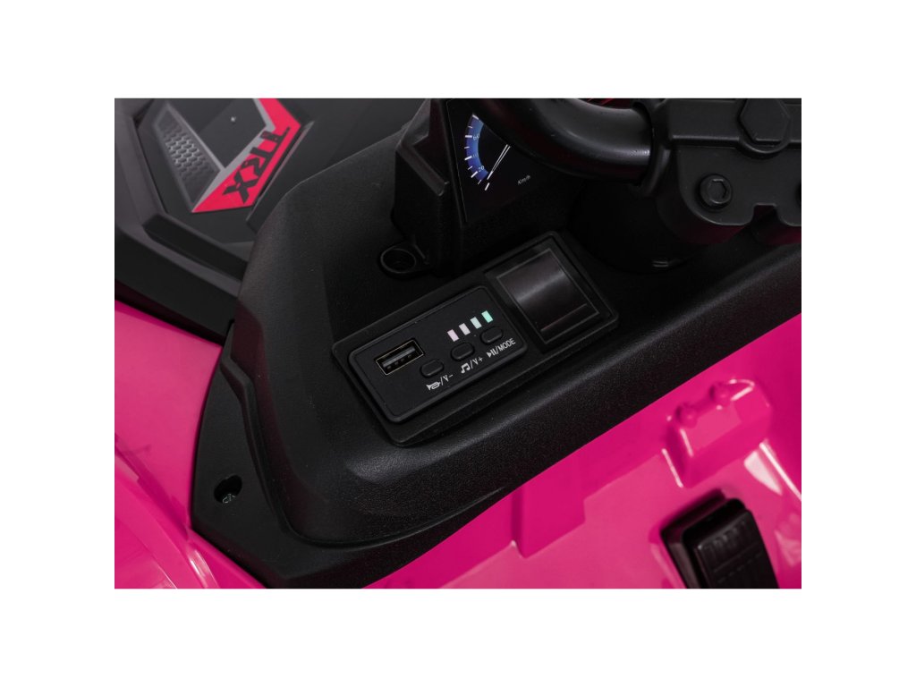 Součástí výbavy jsou také přední LED světla, otevíratelné dveře a prostorný kufr o rozměrech 42 x 28 x 10 cm. Hudební panel nabízí MP3 přehrávač, Bluetooth, USB vstup a tlačítka s melodiemi a klaksonem přímo na volantu. Indikátor nabití baterie umožní mít neustále přehled o stavu vozítka.