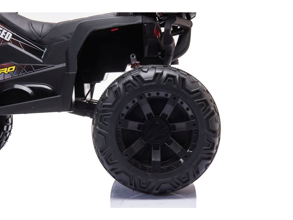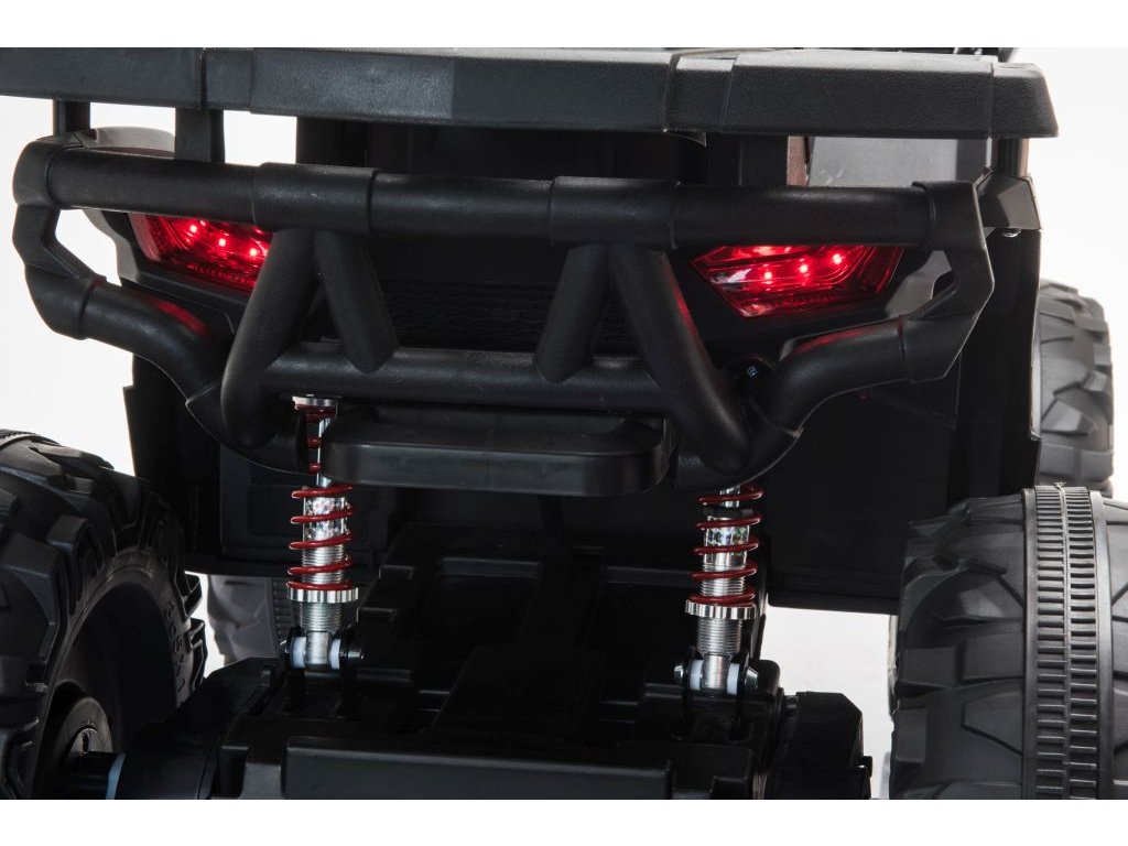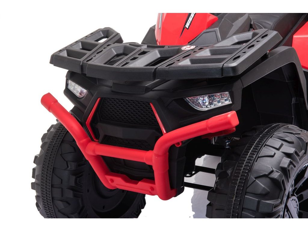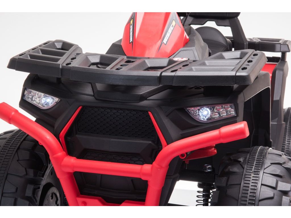 Čtyřkolka má sedadlo z ekologické kůže a pěnová EVA kola, což zpříjemní dítěti jízdu. Velkovu výhodou čtyřkolky jsou přední a zadní světla. O bezpečnost se postará automatická brzda, která se aktivuje při uvolnění plynového pedálu.
