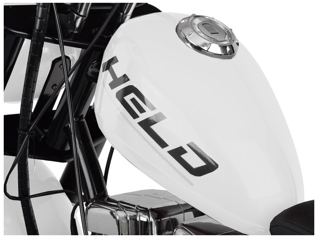Motorka má zadní kotoučovou brzdu, která zajišťuje bezpečné zastavení. K pohodlné jízdě přispívají nafukovací kola, odpružení zadní nápravy a sedadlo potažené eko kůží. Pro snadné parkování je model vybaven stojánkem. Součástí balení jsou také boční kolečka, která pomáhají při prvních jízdách a lze je později odmontovat.
