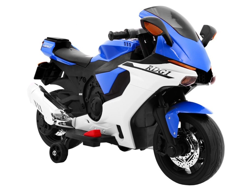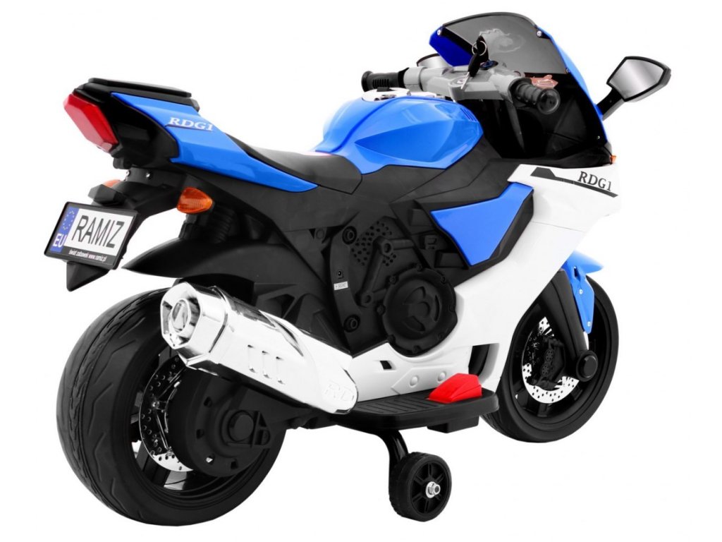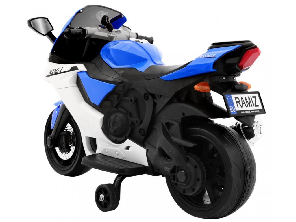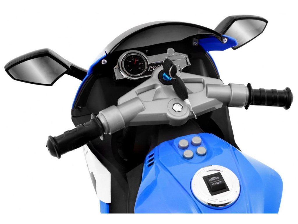 Dětská elektrická motorka R1 je svým vzhledem k nerozeznání od opravdové. Motorka pro mladé nadšence na své reálnosti dodává i tím, že se startuje klíčem a má přepínače směru jízdy dopředu a dozadu. Dále rozsvítí LED světla a dítě si může i zatroubit na krásně znící klakson. Ergonomické sedadlo je navíc velmi pohodlné. Na bezpečí dbají odnímatelná boční kolečka, které jistě brzy nebudou potřeba, protože díky této dětské motorky se dítě naučí udržet balanc raz dva. Kola jsou vyrobena z plastu a mají gumový lem. Díky tomu děti nemusí jezdit pouze po chodníku ale taky po trávě a dalších terénech. Motorka je vhodná pro děti od 3 let.