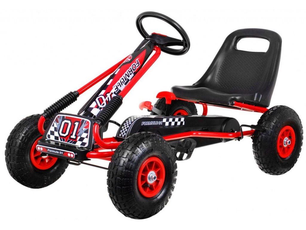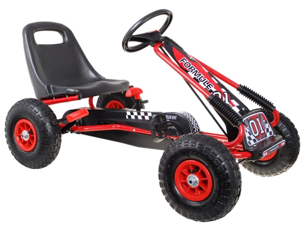 Dětská šlapací motokára formule 01 je bezpečná a pohodlná. Má speciálně navržený rám a jedinečný design. Především má nafukovací gumová kola, díky nimž se stává jízda komfortnější. Motokára má ruční brzdu na dva kola a nastavitelné sedadlo na 3 úrovně.