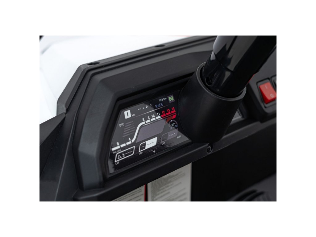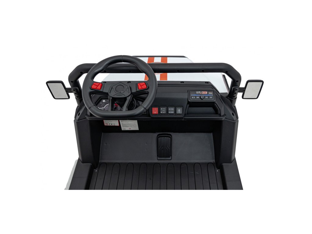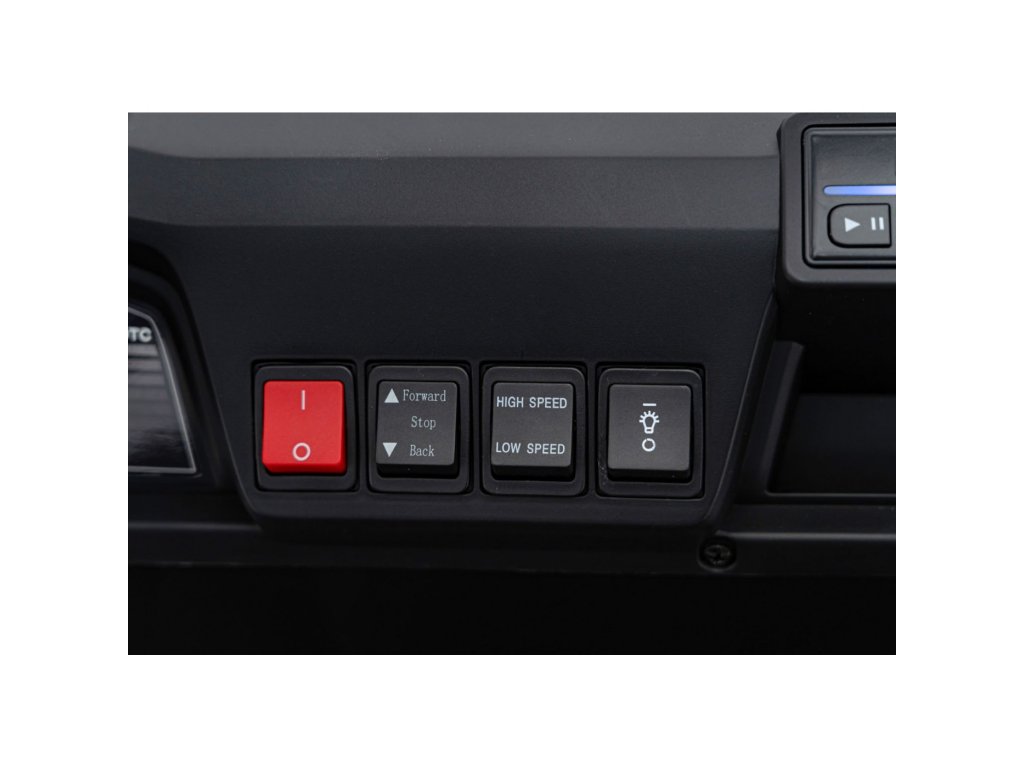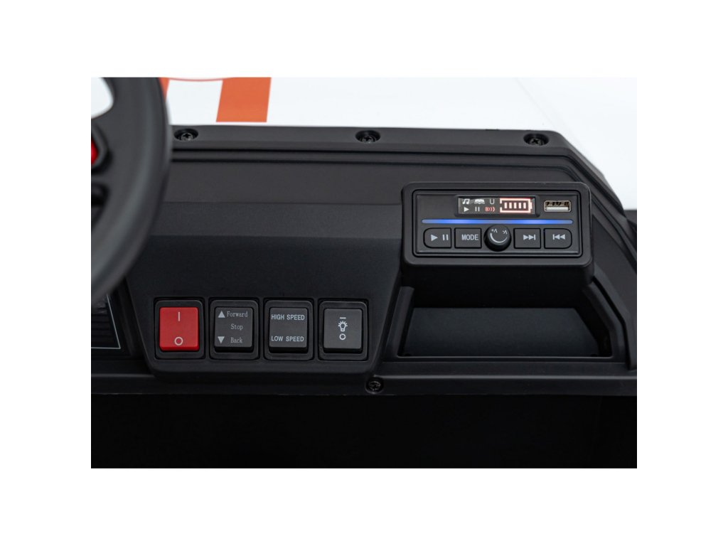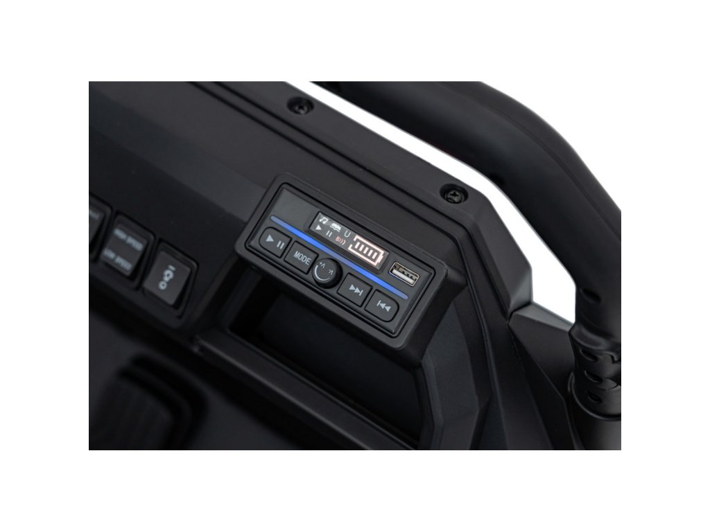Multimediální panel zahrnuje rádio FM, přehrávání MP3, Bluetooth, vstup USB, a tlačítka se zvuky a klaksonem. Vozidlo má LED osvětlení vpředu i vzadu, včetně vypínače světel a ukazatele stavu baterie.