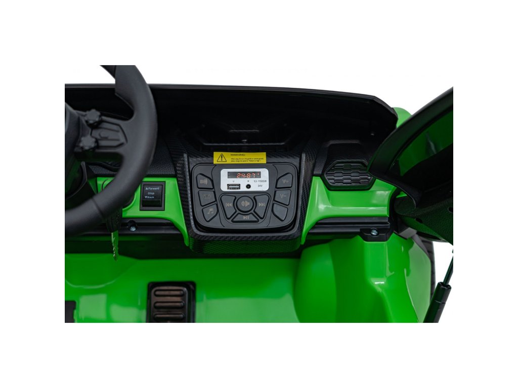 Součástí výbavy je bohatý multimediální panel s rádiem FM, MP3, USB, AUX a Bluetooth. Rodiče mají plnou kontrolu díky dálkovému ovladači 2,4 GHz s třemi rychlostmi a bezpečnostním tlačítkem STOP.