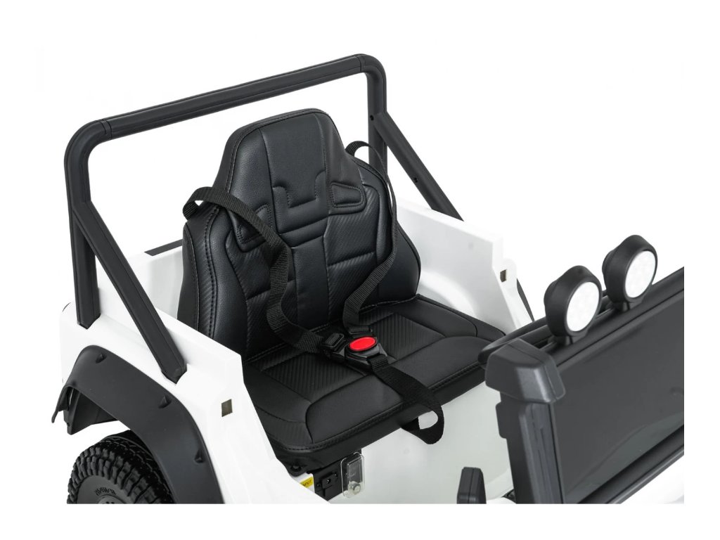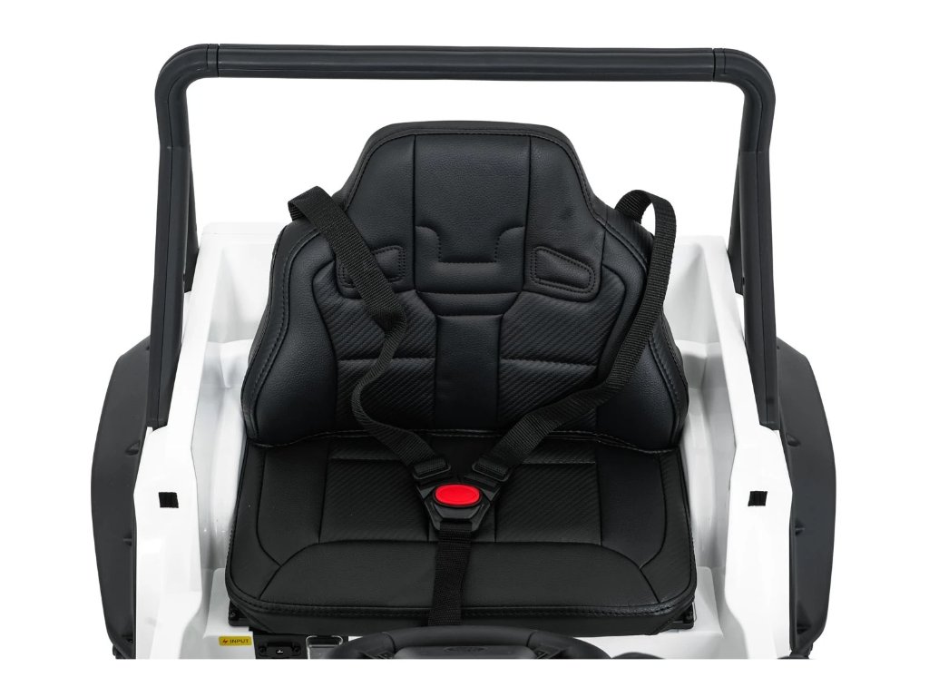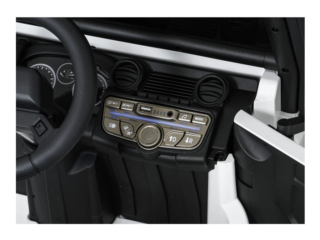 Jednomístné sedadlo z ekokůže s tříbodovým bezpečnostním pásem zajišťuje bezpečí, zatímco LED osvětlení, otevírací dveře a zvukové efekty přispívají k realistickému zážitku z jízdy. Hudební panel s MP3, Bluetooth, AUX a USB vstupem umožní přehrávat oblíbenou hudbu.