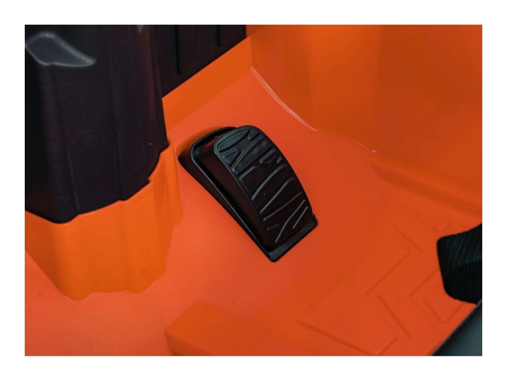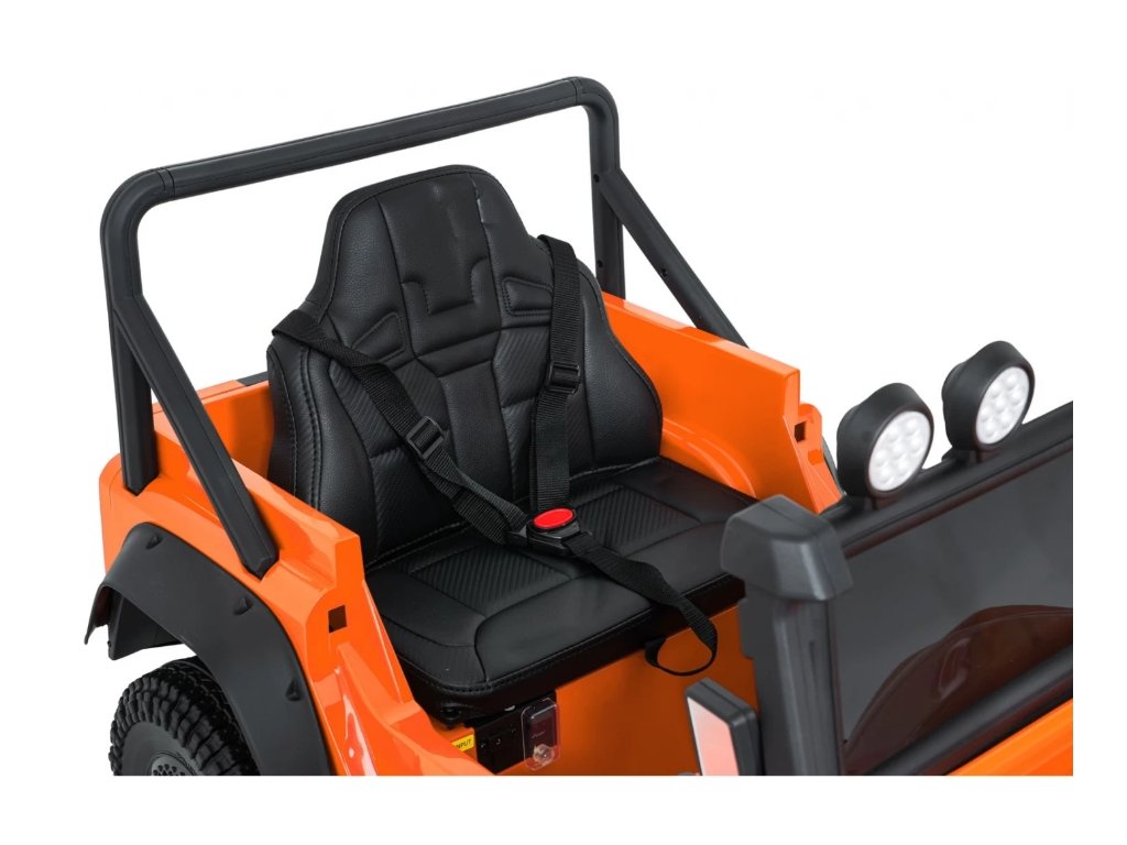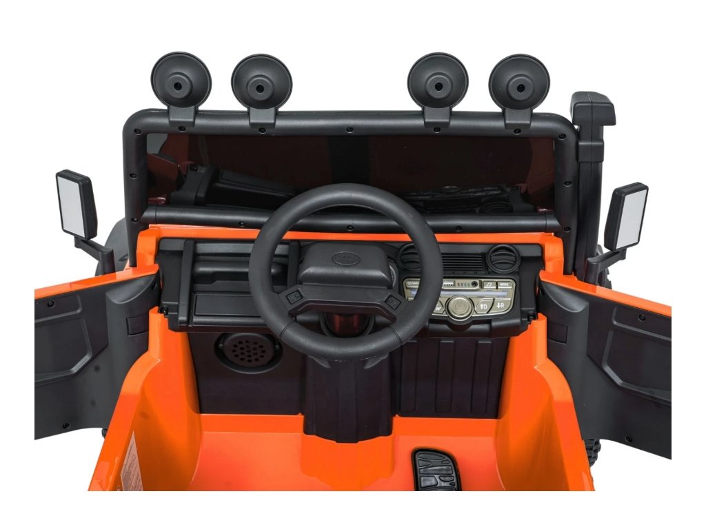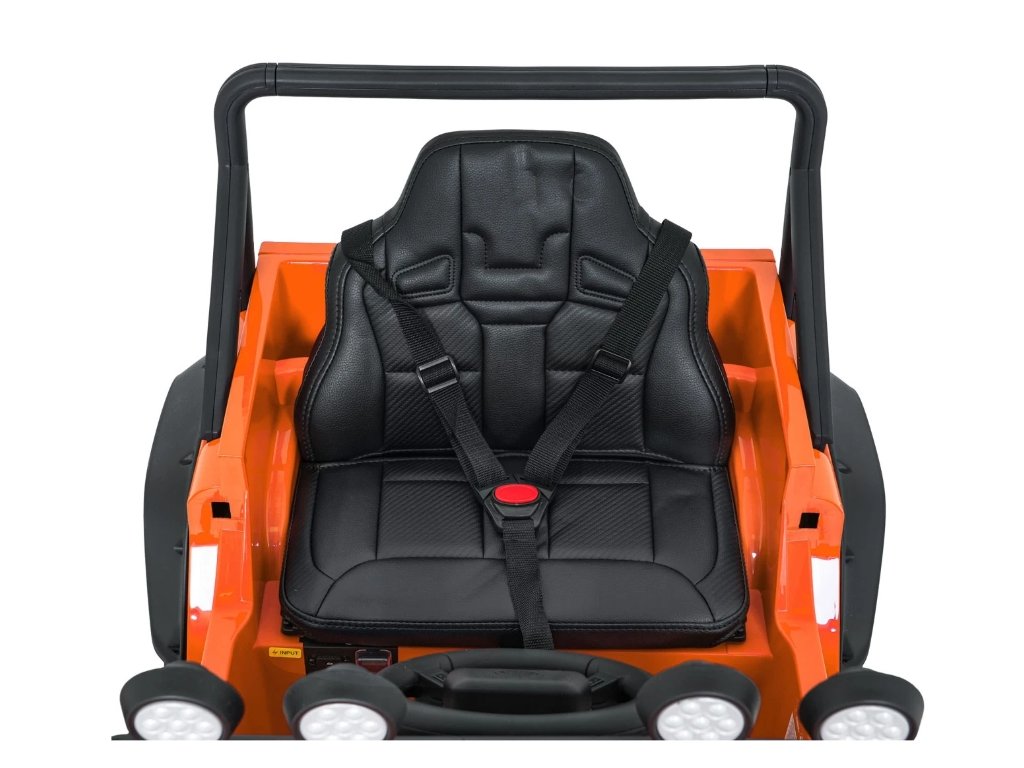 Jednomístné sedadlo z ekokůže s tříbodovým bezpečnostním pásem zajišťuje bezpečí, zatímco LED osvětlení, otevírací dveře a zvukové efekty přispívají k realistickému zážitku z jízdy. Hudební panel s MP3, Bluetooth, AUX a USB vstupem umožní přehrávat oblíbenou hudbu.