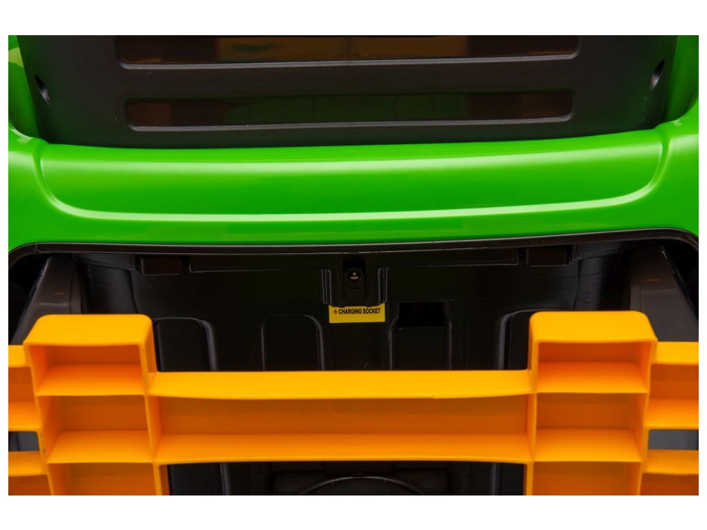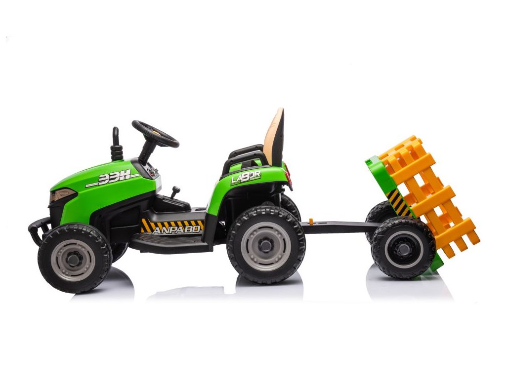 Dětský elektrický traktor s přívěsem má dva velmi výkonné motory 45W a baterii s kapacitou 12V 7Ah. Traktor má přední LED světla a hudební panel se vstupem Bluetooth. Maximální nosnost traktoru je 30 kg.