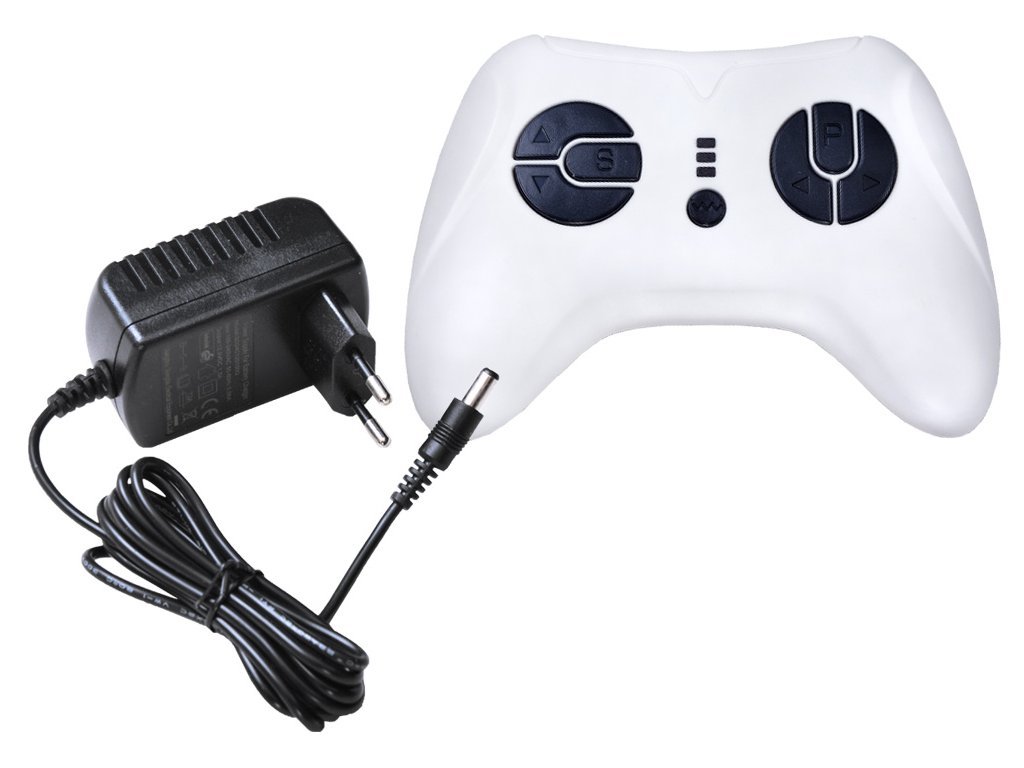 Dálkové ovládání 2,4GHz je vybaveno tlačítky se třemi rychlostmi a bezpečnostním tlačítkem Stop, které ihned zastaví vozidlo a vypne všechny jeho funkce.