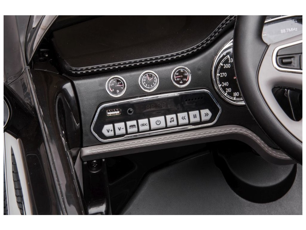 Interiér autíčka je vybaven vstupy MP3, USB, SD, a tlačítky s melodiemi. Na cestu si posvítíte předními i zadními LED světly.