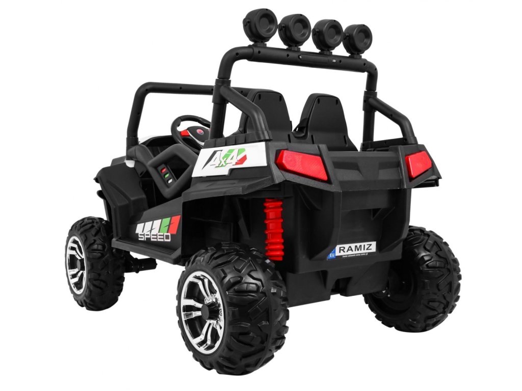 Dětské elektrické autíčko Buggy bez větších problémů zvládá jízdu po terénu a různé převýšení. Díky vysokému podvozku je přímo určené pro jízdu v terénu a přes louže. Pokud máte doma malého závodníka, případně závodnici, pak je toto autíčko stvořené pro Vás. Po stisknutí startovacího knoflíku se ozve startovací zvuk a rozsvítí se přední světla. Ty lze přepínat pomocí tlačítka na ovládacím panelu. Mohou svítit, blikat nebo jednoduše zůstat vypnuté. V autíčku můžete naladit FM rádio, spustit nahranou hudbu nebo jej spárovat s telefonem pomocí BT funkce a přehrávat hudbu přímo z telefonu. Díky třem předehraným písničkám pomůžete dětem se zdokonalovat v angličtině. Tyto funkce dítě přepíná pohodlně i na volantu. Na panelu můžete ovládat hlasitost, což ocení hlavně rodiče :)