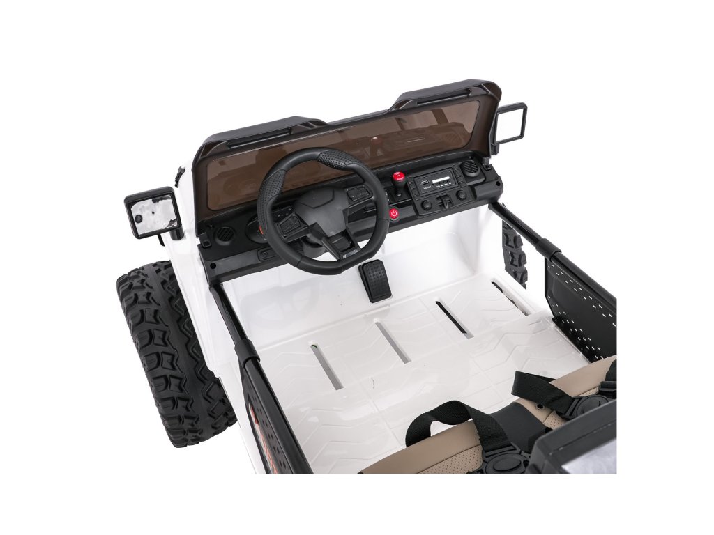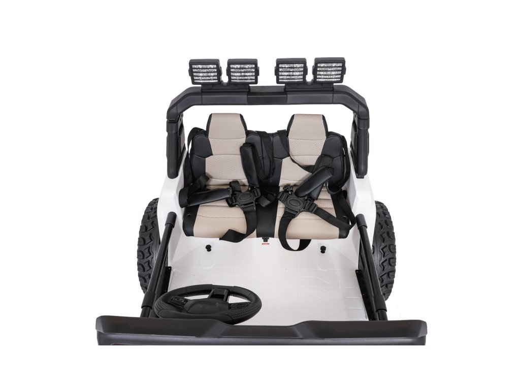 Autíčko můžete ovládat pomocí dálkového ovládání, které pracuje na frekvenci 2,4 GHz. Na dálkovém ovladači jsou tři rychlosti a bezpečnostní tlačítko STOP, které po zmáčknutí okamžitě zastaví autíčko. Sedačka je pokryta ekologickou kůží a nachází se na ní bezpečnostní pásy.