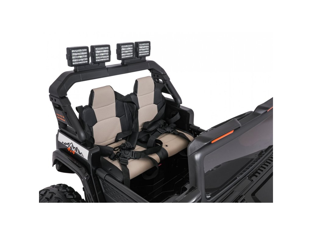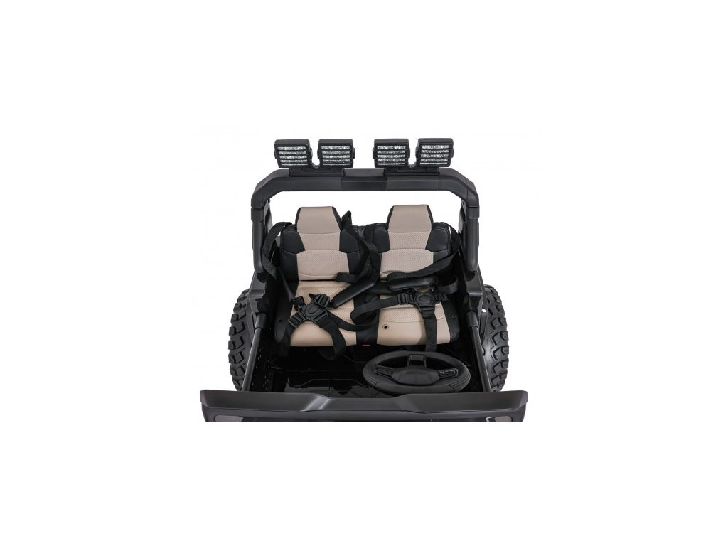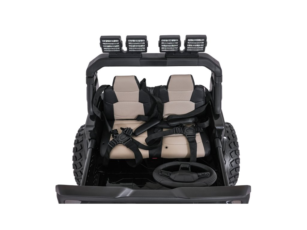 Autíčko můžete ovládat pomocí dálkového ovládání, které pracuje na frekvenci 2,4 GHz. Na dálkovém ovladači jsou tři rychlosti a bezpečnostní tlačítko STOP, které po zmáčknutí okamžitě zastaví autíčko. Sedačka je pokryta ekologickou kůží a nachází se na ní bezpečnostní pásy.