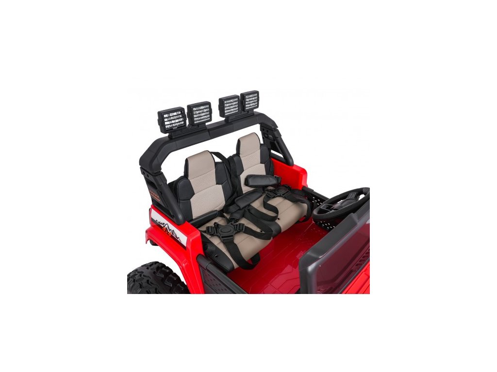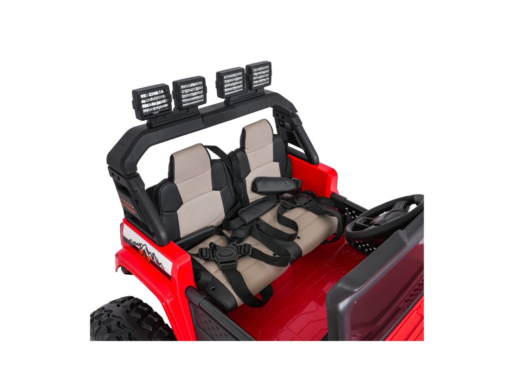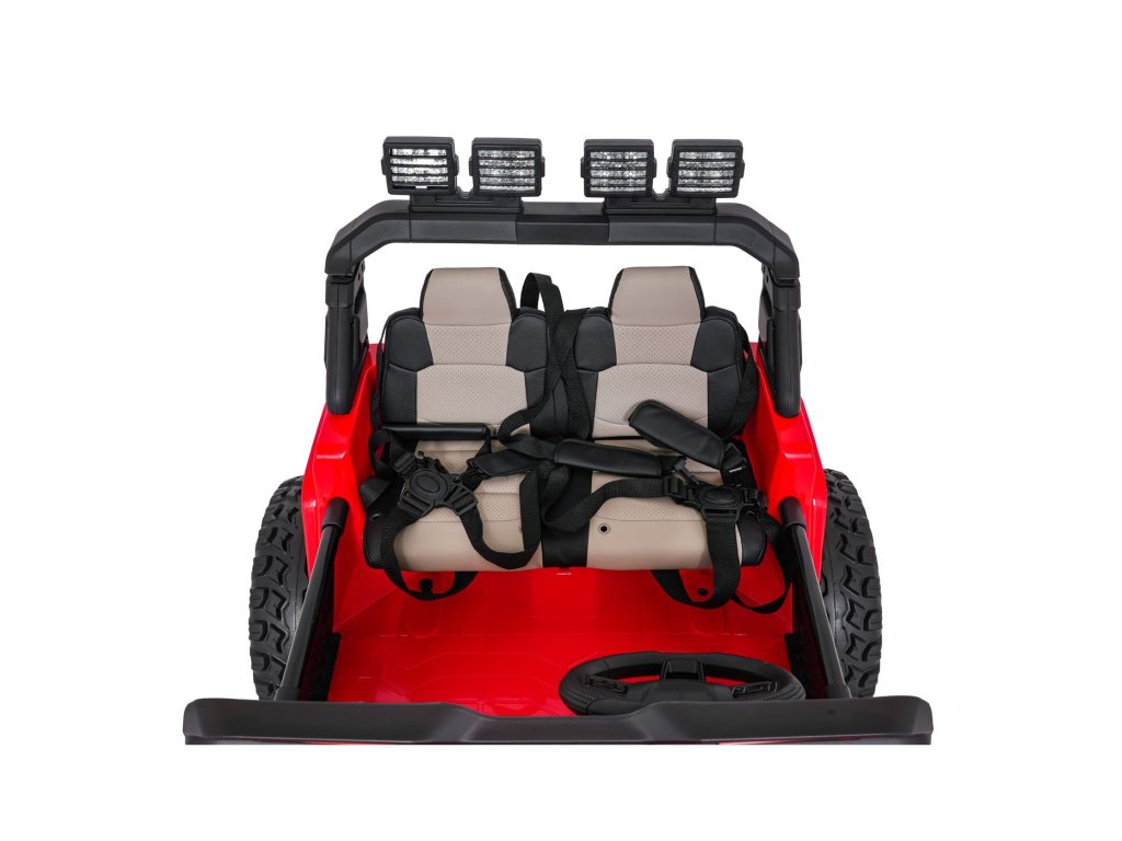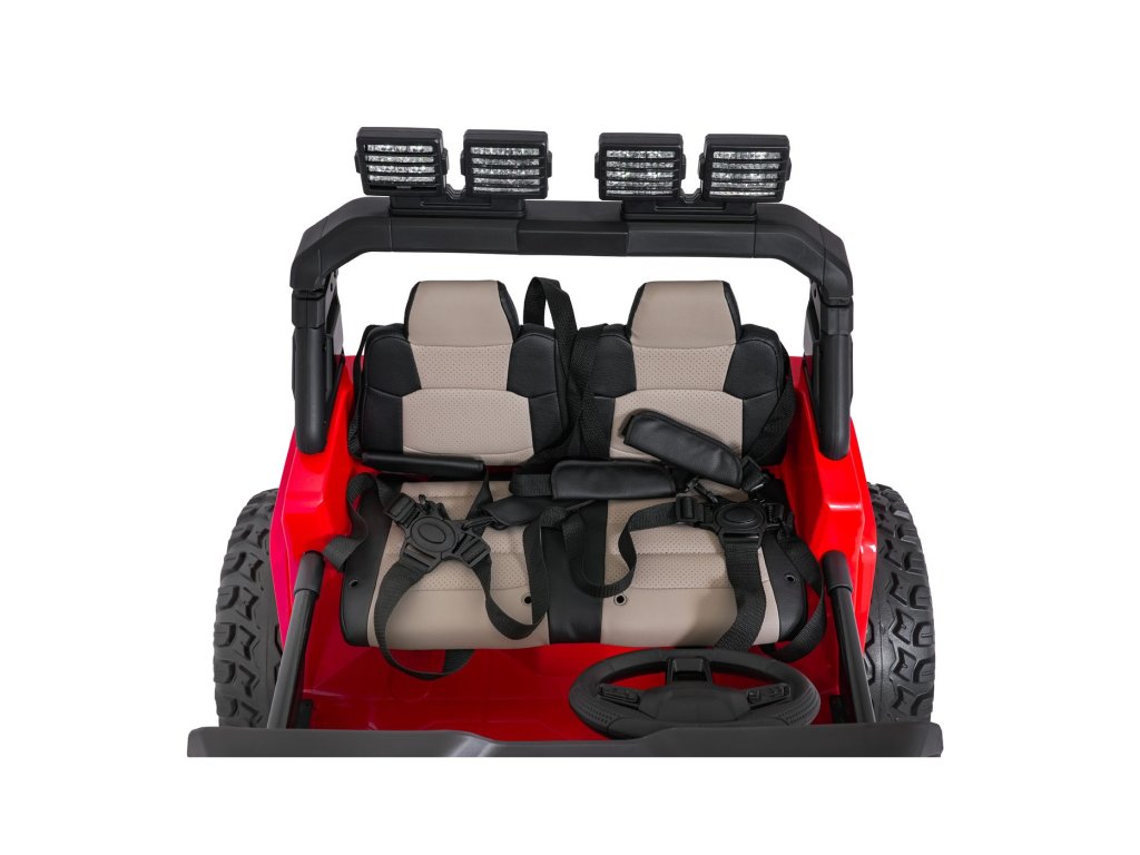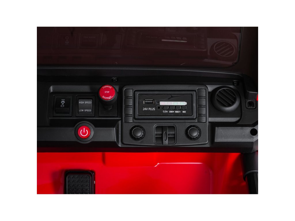 Autíčko můžete ovládat pomocí dálkového ovládání, které pracuje na frekvenci 2,4 GHz. Na dálkovém ovladači jsou tři rychlosti a bezpečnostní tlačítko STOP, které po zmáčknutí okamžitě zastaví autíčko. Sedačka je pokryta ekologickou kůží a nachází se na ní bezpečnostní pásy.