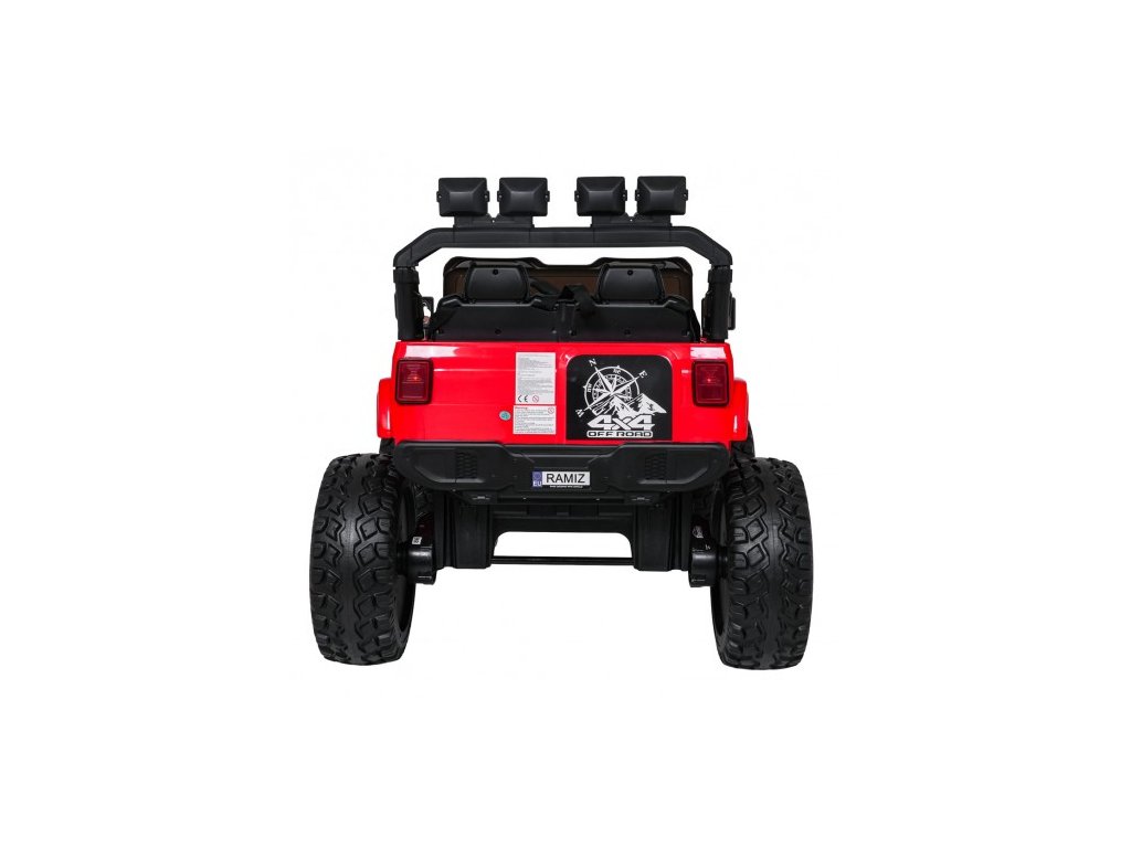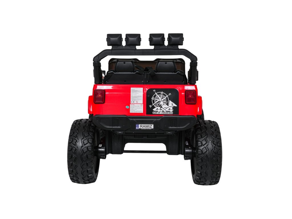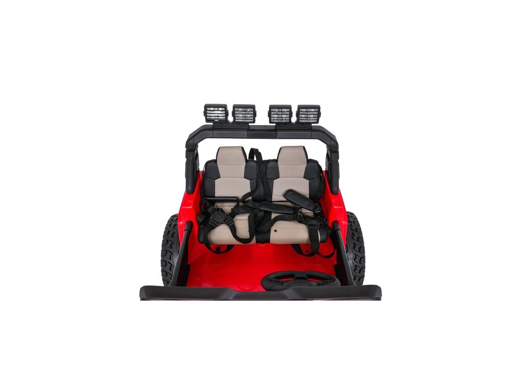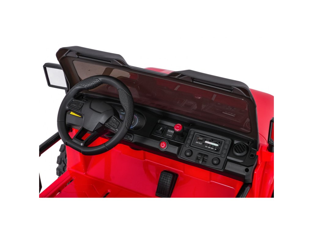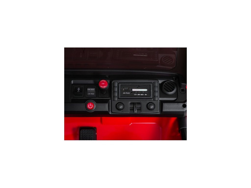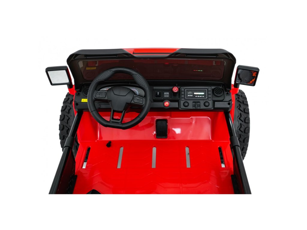 Autíčko můžete ovládat pomocí dálkového ovládání, které pracuje na frekvenci 2,4 GHz. Na dálkovém ovladači jsou tři rychlosti a bezpečnostní tlačítko STOP, které po zmáčknutí okamžitě zastaví autíčko. Sedačka je pokryta ekologickou kůží a nachází se na ní bezpečnostní pásy.