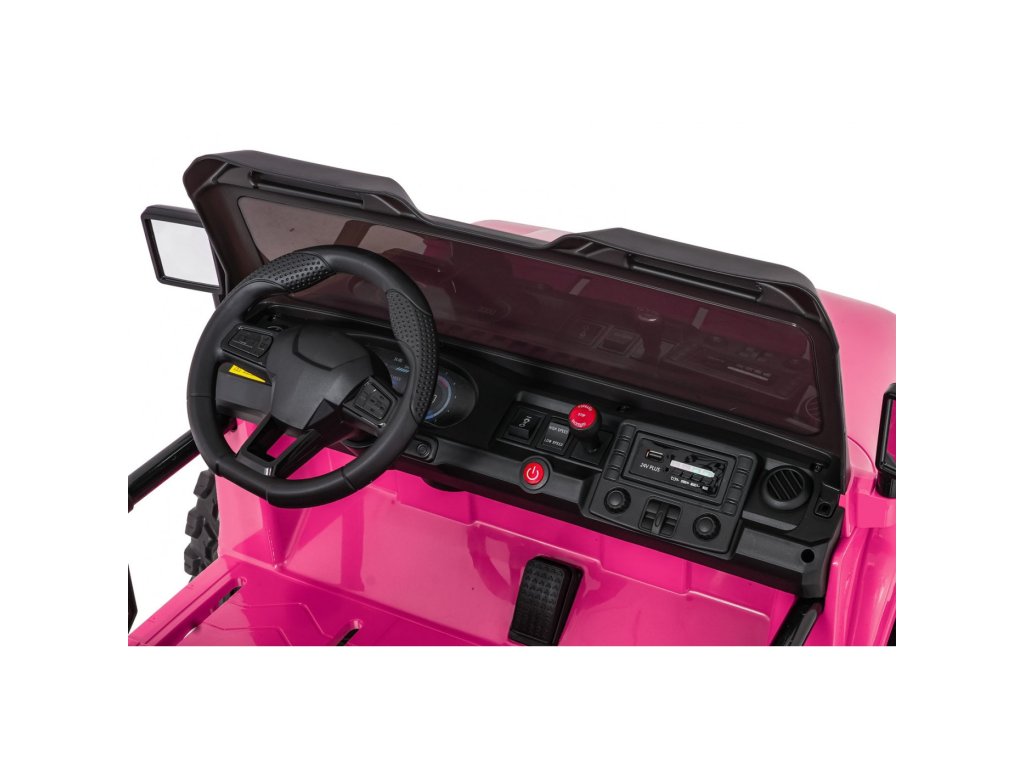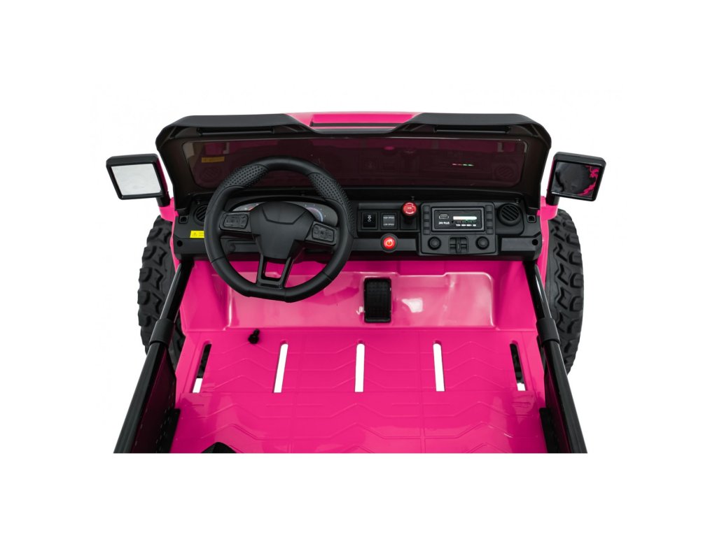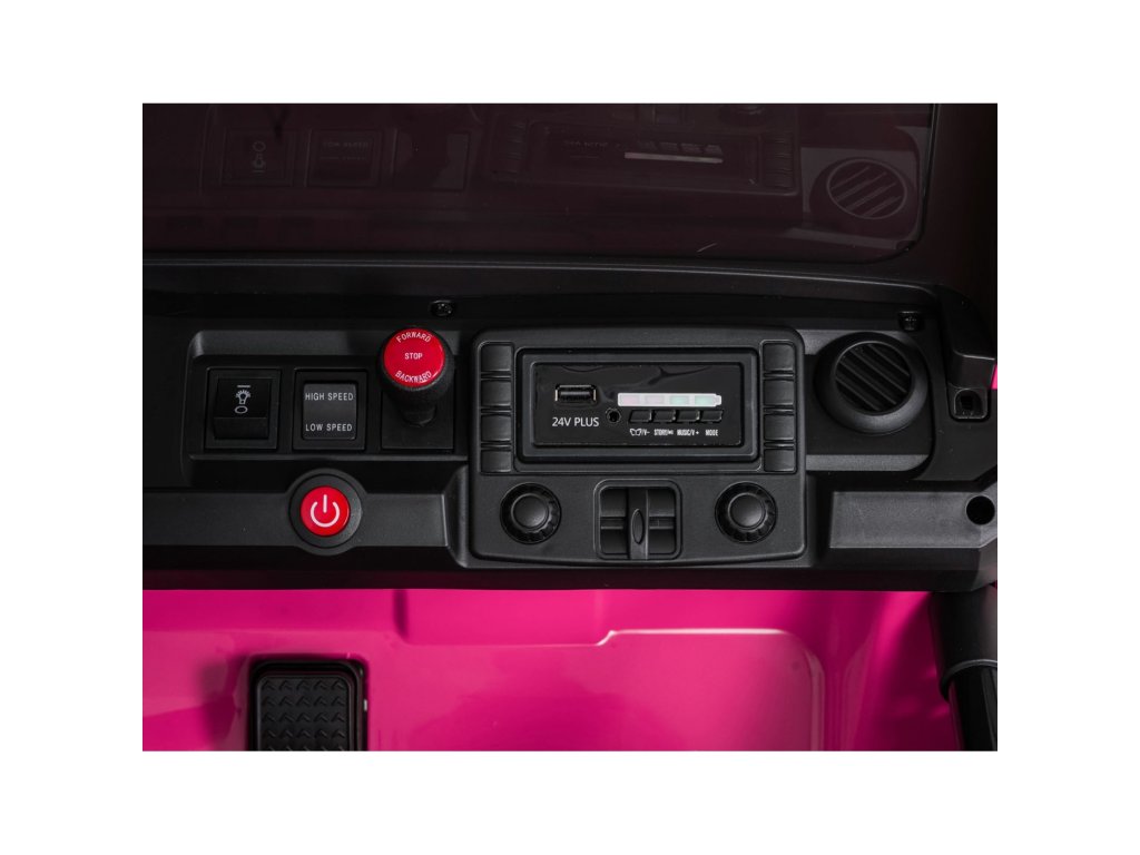 Autíčko můžete ovládat pomocí dálkového ovládání, které pracuje na frekvenci 2,4 GHz. Na dálkovém ovladači jsou tři rychlosti a bezpečnostní tlačítko STOP, které po zmáčknutí okamžitě zastaví autíčko. Sedačka je pokryta ekologickou kůží a nachází se na ní bezpečnostní pásy.