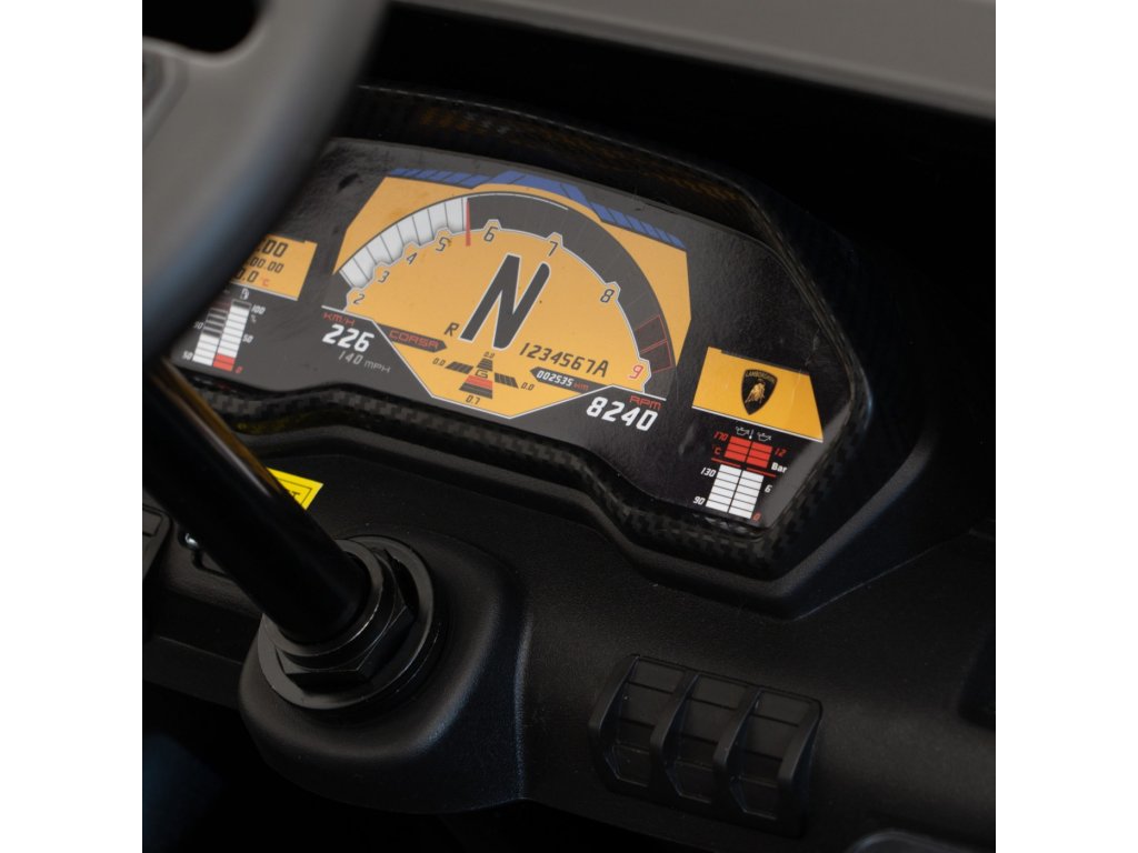 Dětské elektrické autíčko licencované společností Lamborghini je vybaveno exkluzivní sedačkou z ekologické kůže, hudebním panelem se vstupy MP3, USB, AUX a Bluetooth, tlačítky s předem nahranými melodiemi a předními i zadními LED světly. Při startování uslyšíte charakteristické zvuky motoru.