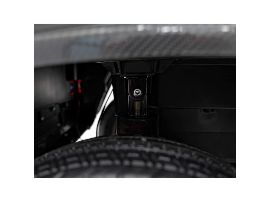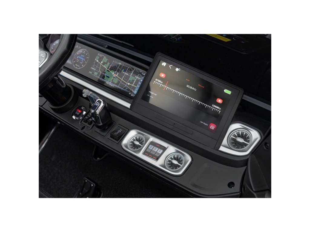 Interiér je vybaven sedadlem z ekokůže pro dvě děti s bezpečnostními pásy a moderním audio panelem. Ten zahrnuje vyjímatelný MP4 displej, FM rádio, Bluetooth a tlačítka zvukových efektů a klaksonu na volantu. O zážitek z jízdy se starají i světelné efekty – LED světla vpředu, vzadu i na střeše, doplněné realistickými zvuky startu a zrychlení.