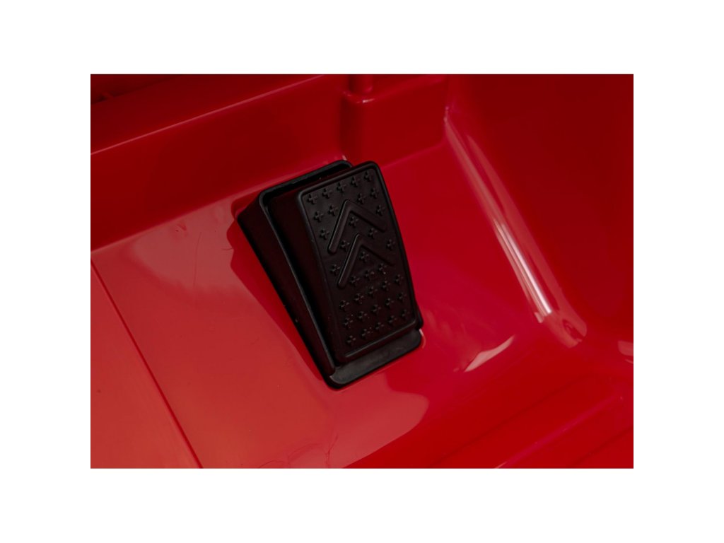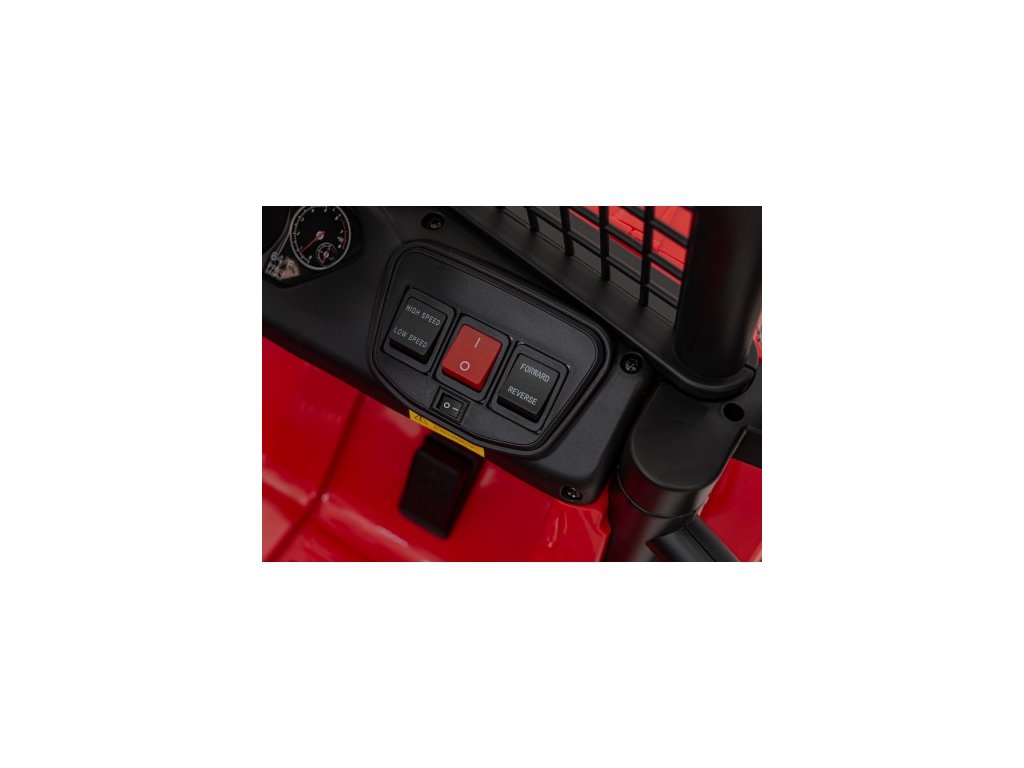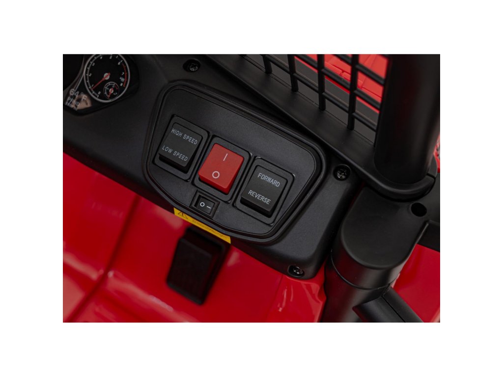Autíčko můžete ovládat pomocí dálkového ovládání, které pracuje na frekvenci 2,4 GHz. Na dálkovém ovladači jsou tři rychlosti a bezpečnostní tlačítko STOP, které po zmáčknutí okamžitě zastaví autíčko. Sedačka je pokryta ekologickou kůží a nachází se na ní bezpečnostní pásy.