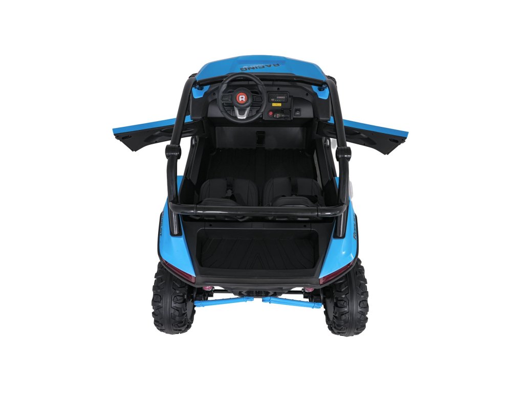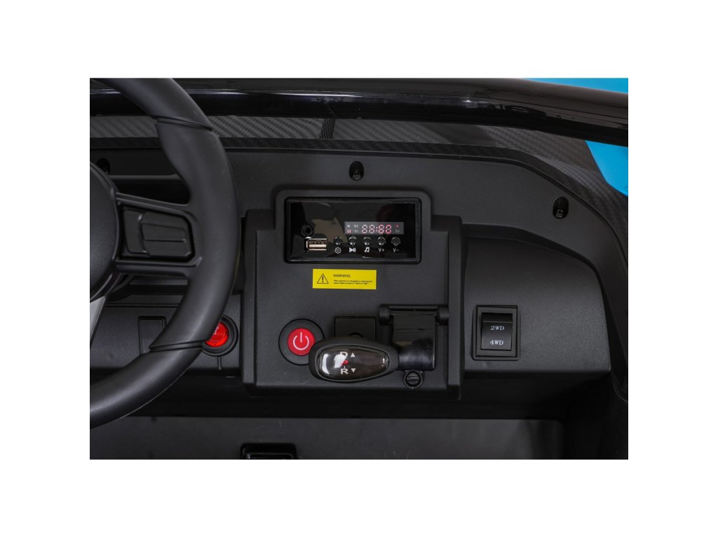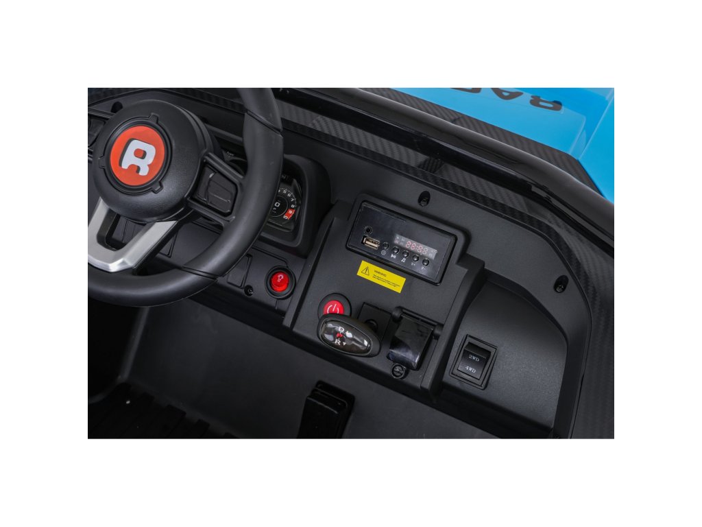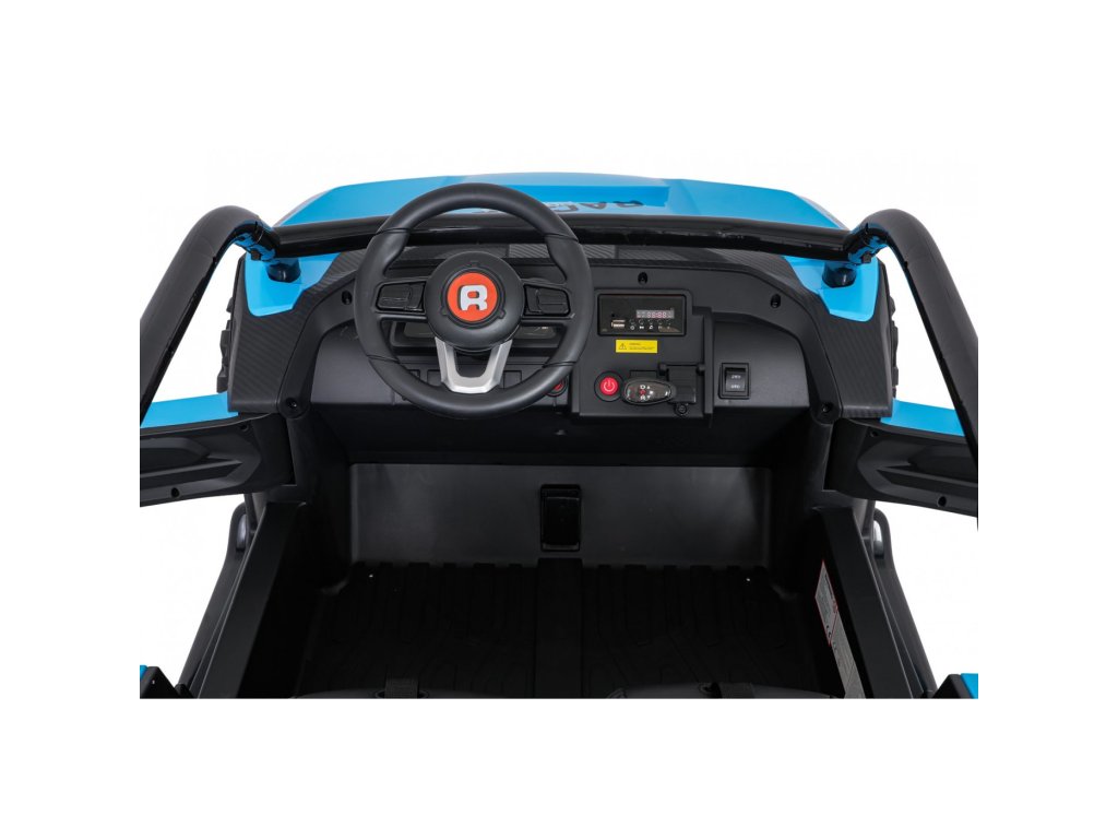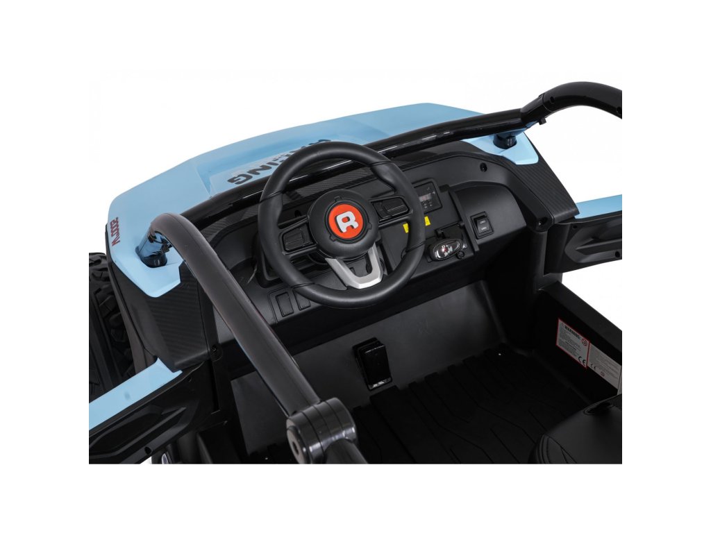 Dvě samostatné sedačky potažené ekokůží jsou vybaveny bezpečnostními pásy a umožňují jízdu dvěma dětem současně. Otevíratelné dveře s bezpečnostní pojistkou zajišťují snadné a bezpečné nastupování. LED světla vpředu i vzadu, realistické zvuky motoru a další audio efekty přinášejí autentický zážitek z jízdy. Multimediální panel umožňuje připojení přes USB, AUX i MP3, nechybí ani FM rádio a ovládací tlačítka na volantu.