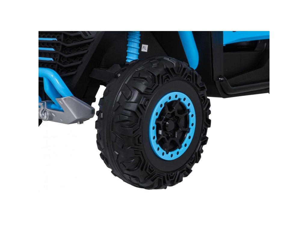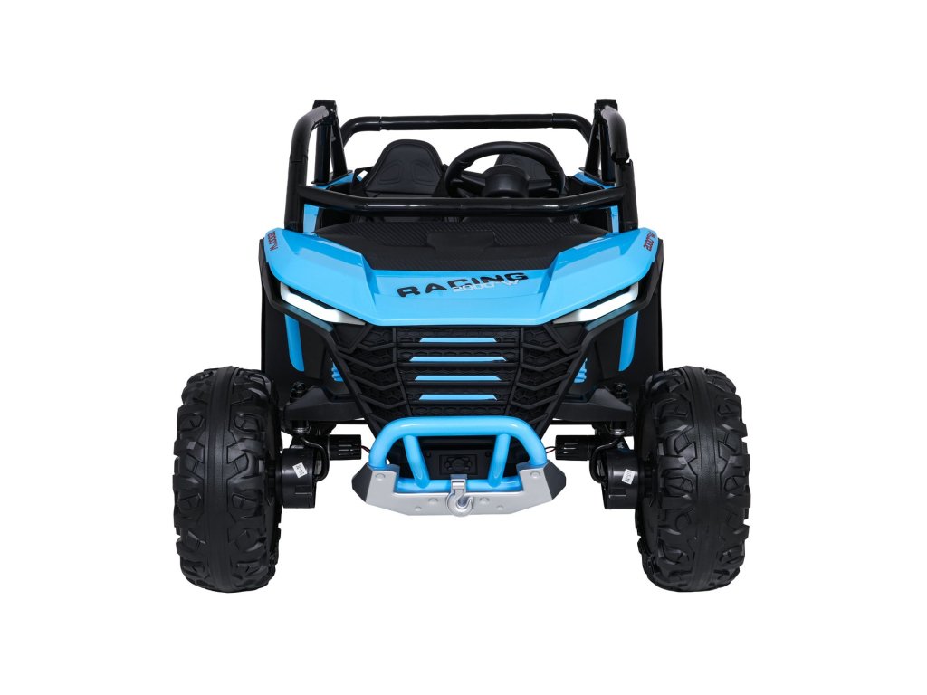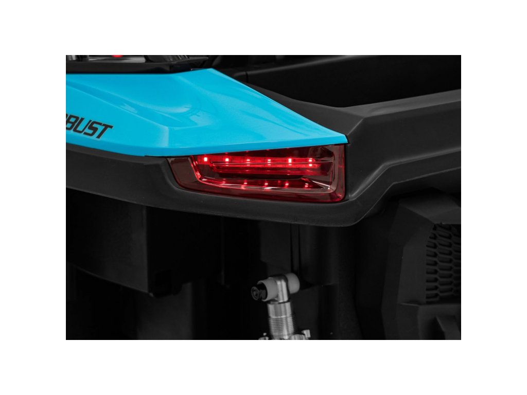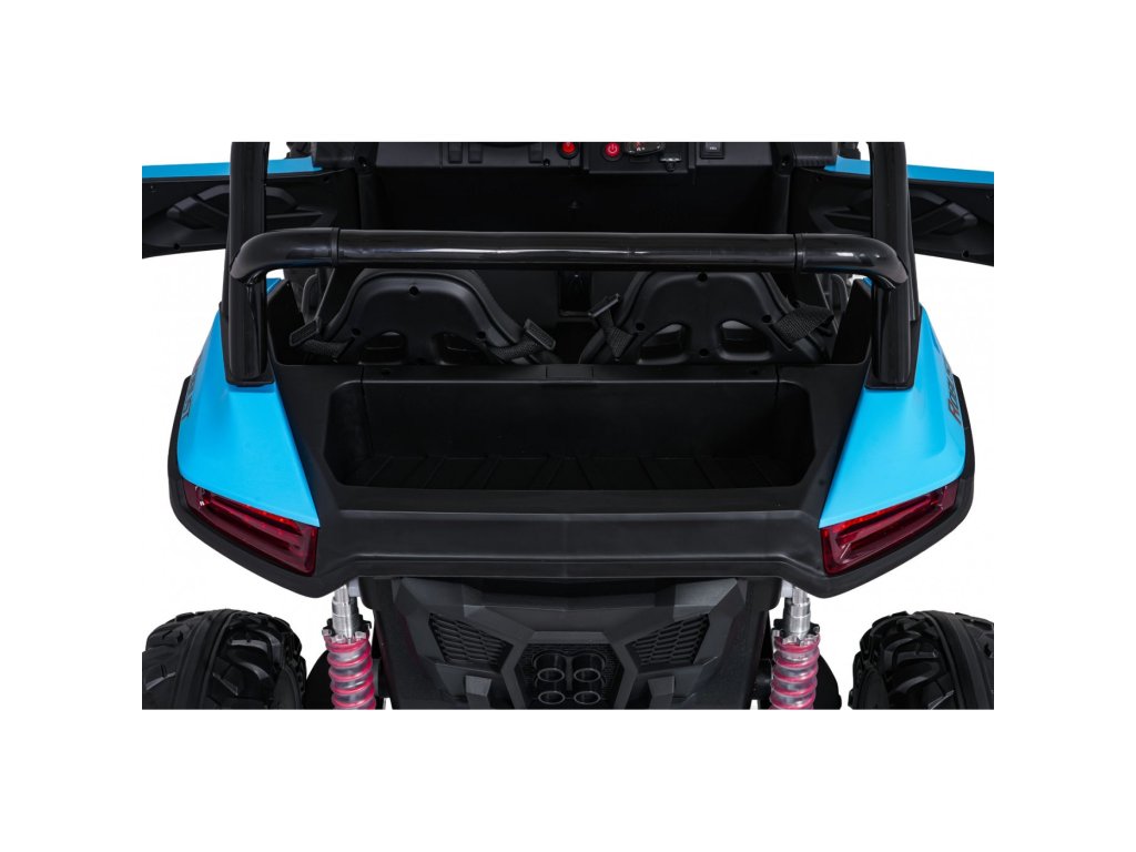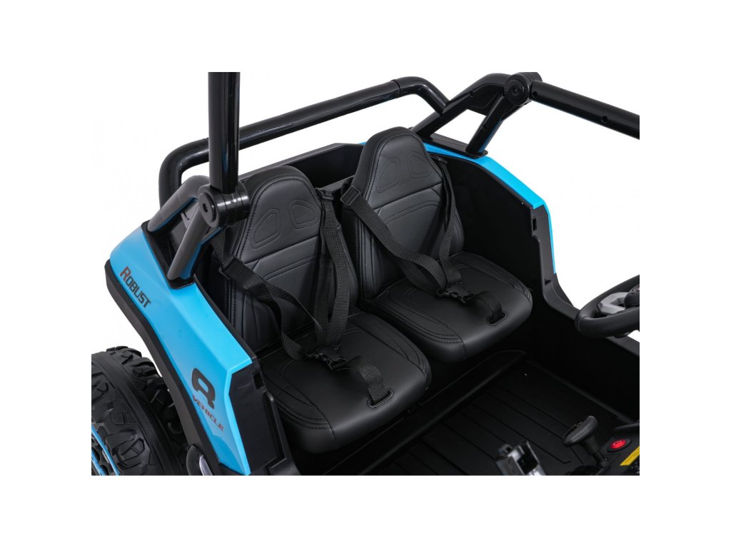 Dvě samostatné sedačky potažené ekokůží jsou vybaveny bezpečnostními pásy a umožňují jízdu dvěma dětem současně. Otevíratelné dveře s bezpečnostní pojistkou zajišťují snadné a bezpečné nastupování. LED světla vpředu i vzadu, realistické zvuky motoru a další audio efekty přinášejí autentický zážitek z jízdy. Multimediální panel umožňuje připojení přes USB, AUX i MP3, nechybí ani FM rádio a ovládací tlačítka na volantu.