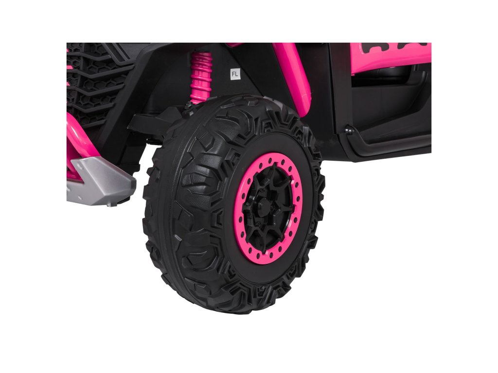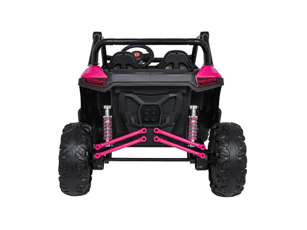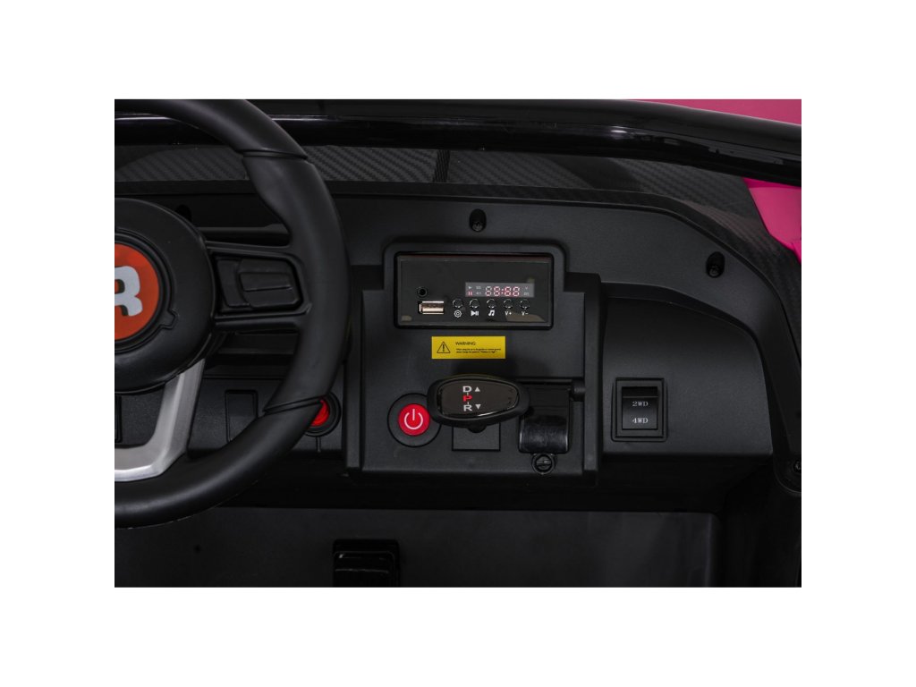 Dvě samostatné sedačky potažené ekokůží jsou vybaveny bezpečnostními pásy a umožňují jízdu dvěma dětem současně. Otevíratelné dveře s bezpečnostní pojistkou zajišťují snadné a bezpečné nastupování. LED světla vpředu i vzadu, realistické zvuky motoru a další audio efekty přinášejí autentický zážitek z jízdy. Multimediální panel umožňuje připojení přes USB, AUX i MP3, nechybí ani FM rádio a ovládací tlačítka na volantu.