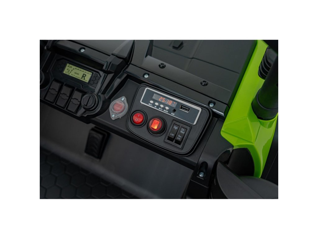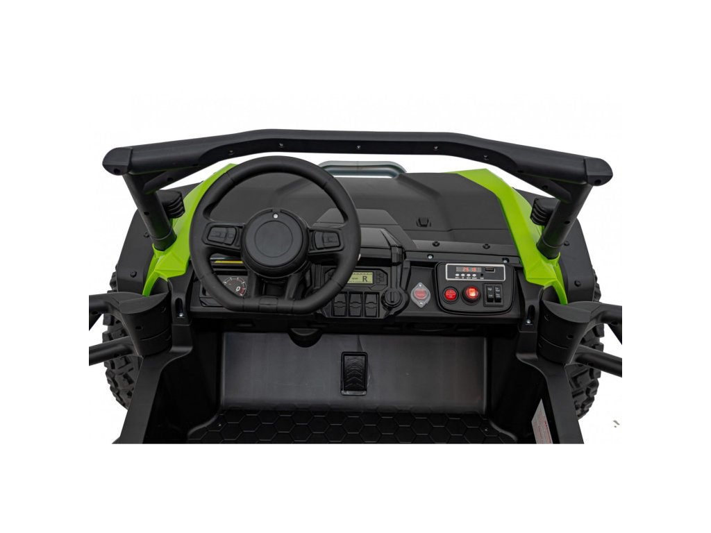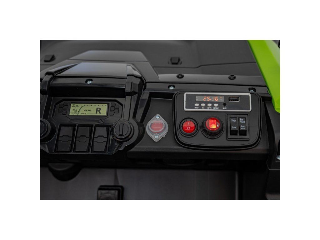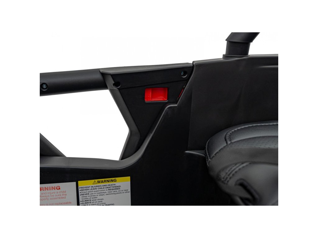 Autíčko můžete ovládat pomocí dálkového ovládání, které pracuje na frekvenci 2,4 GHz. Na dálkovém ovladači jsou tři rychlosti a bezpečnostní tlačítko STOP, které po zmáčknutí okamžitě zastaví autíčko. Sedačka je pokryta ekologickou kůží a nachází se na ní bezpečnostní pásy.