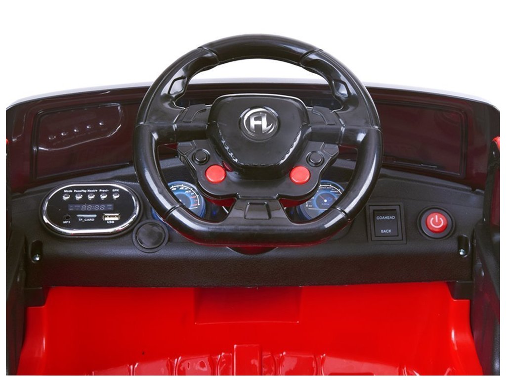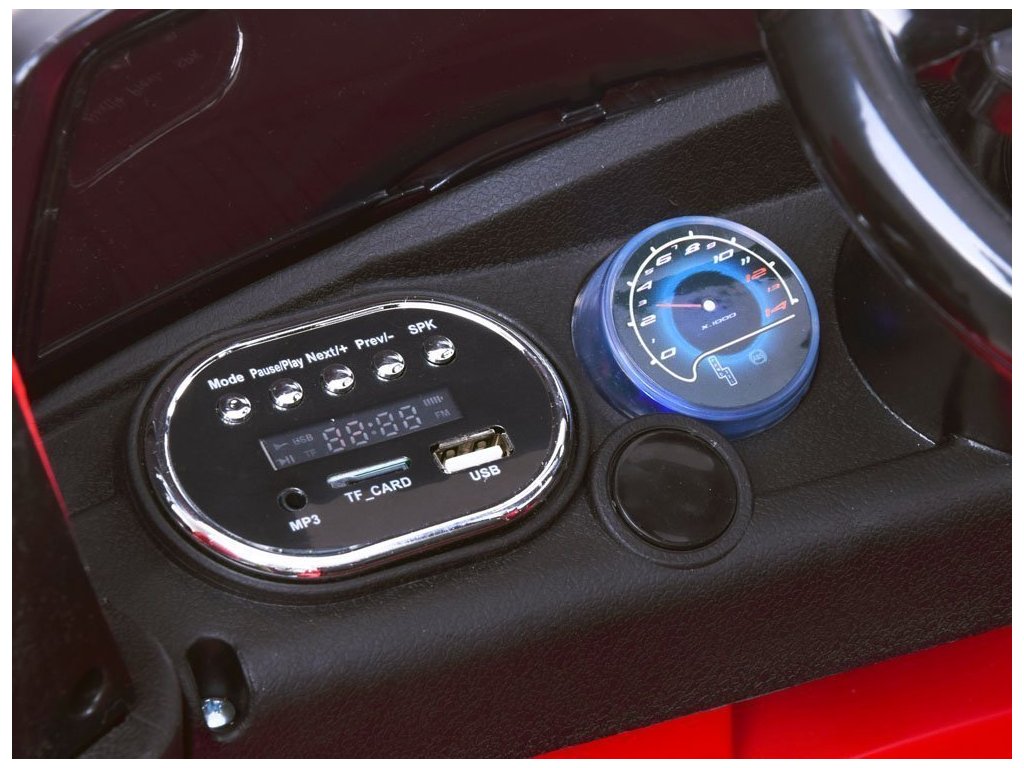 Vozítko je vybaveno svítícími předními a zadními světly a podsvícenou palubní deskou, digitálním ukazatelem stavu baterie, bezpečnostním nastavitelným pásem, které ochraňuje Vaše dítě před vypadnutím z autíčka, výstupem na USB, SD kartu a chytrý telefon.